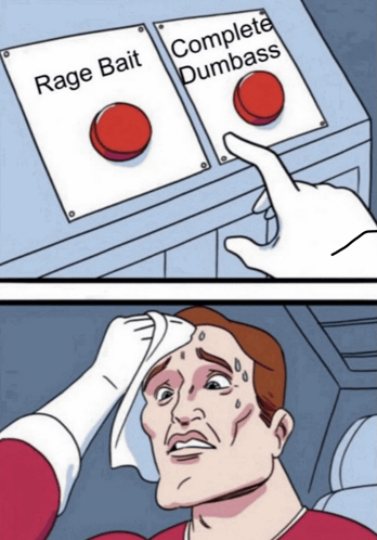 Content Description: a cartoon of a man pressing rage bait and complete dumbass buttons