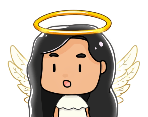 Content Description: a cartoon angel with black hair and wings has a halo on her head