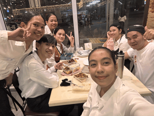Content Description: a group of people sitting at a table with a man wearing a hat that says nike on it