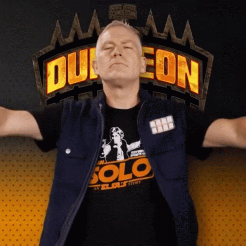 Content Description: a man wearing a solo t-shirt and a vest stands in front of a sign that says dungeon