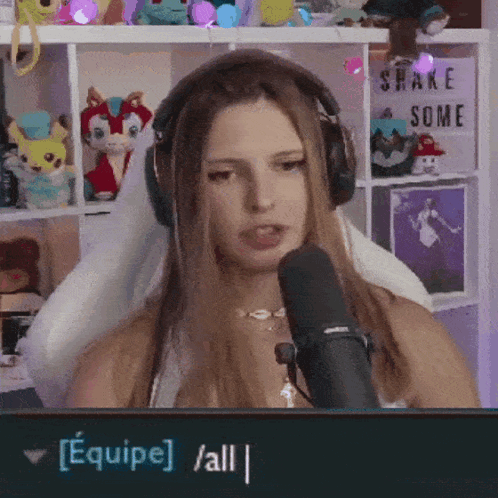 Content Description: a woman wearing headphones is talking into a microphone with a sign that says shake some on it