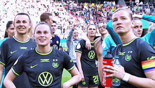Content Description: a woman holding a coca cola bottle and a bottle of water