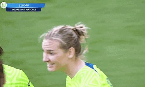 Content Description: a female soccer player is smiling in front of a scoreboard that says 11 popp 2 goals in 9 matches