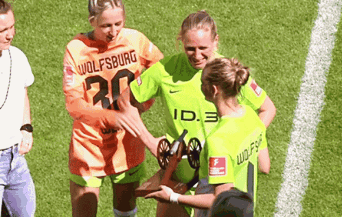 Content Description: a woman in a wolfsburg jersey shakes hands with another woman on a soccer field