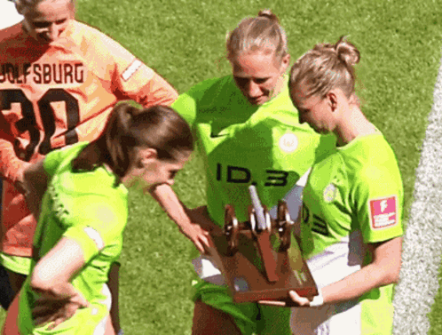 Content Description: three female soccer players wearing green jerseys with id.3 on them