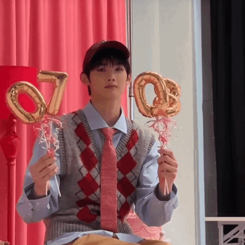 Content Description: a man in a plaid vest and tie is holding balloons in the shape of numbers 70 and 03