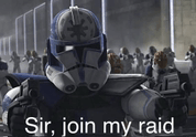 Content Description: a star wars clone trooper says `` sir , join my raid '' while standing in front of a crowd of clones .