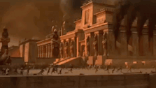 Content Description: a very old building with a lot of statues on it is being destroyed by fire .