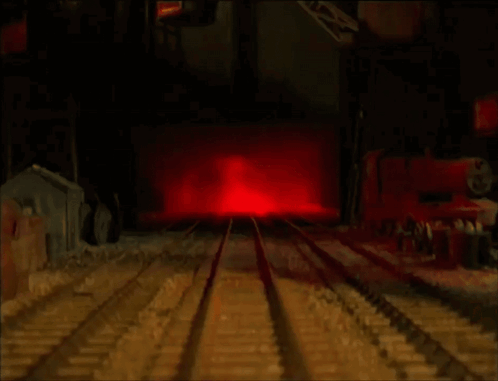Content Description: two cartoon trains are on a train track with a red light in the background