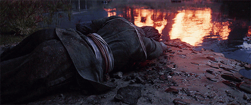 Content Description: a man is laying on the ground in front of a river with a fire in the background