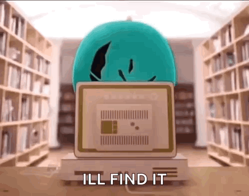 Content Description: a computer is sitting in a library with the words `` ill find it '' written on the screen .