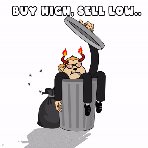 Content Description: a cartoon of a man sitting in a trash can with the words buy high sell low