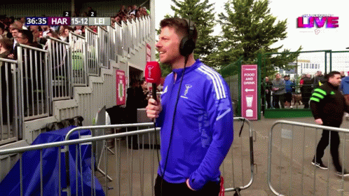 Content Description: a man wearing headphones is holding a microphone in front of a sign that says food & drink