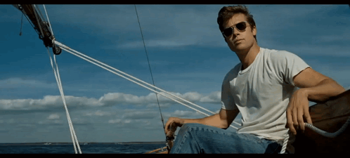 Content Description: a man wearing sunglasses sits on a boat in the water