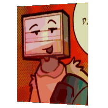 Content Description: a cartoon character with a box head and a speech bubble that says p.