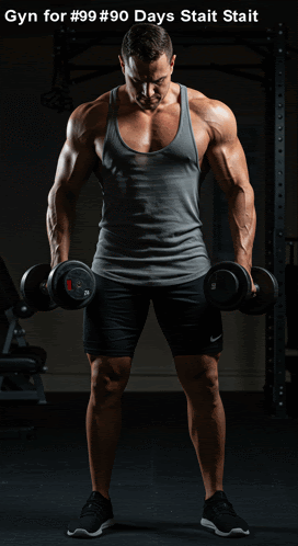 Content Description: a muscular man is lifting dumbbells in a gym with the words gyn for # 99 # 90 days stait stait above him
