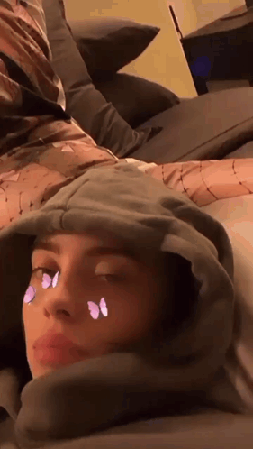 Content Description: a woman is laying on a bed with butterflies on her face and a hoodie on her head .