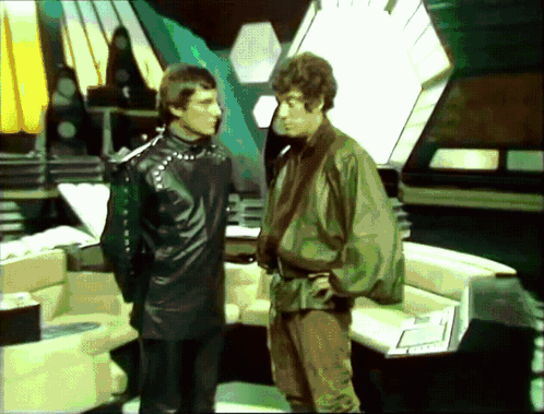 Content Description: two men are standing next to each other in a room and one of them has a green jacket