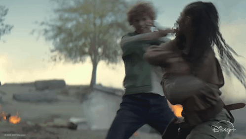 Content Description: a man and a woman are fighting in a scene from a disney + show