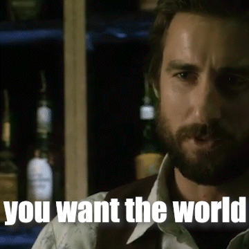 Content Description: a man with a beard is standing in front of a bar and says you want the world