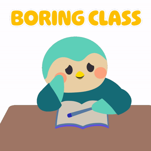 Content Description: an illustration of a penguin sitting at a desk with the words " boring class " above it