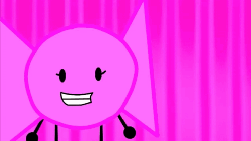 Content Description: a pink cartoon character is smiling and standing on a pink striped background .