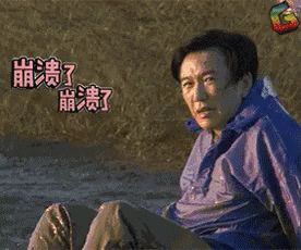 Content Description: a man in a blue jacket is sitting on the ground laughing with chinese writing behind him .