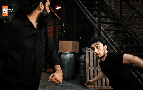 Content Description: a man standing next to another man with a tv logo on the bottom right