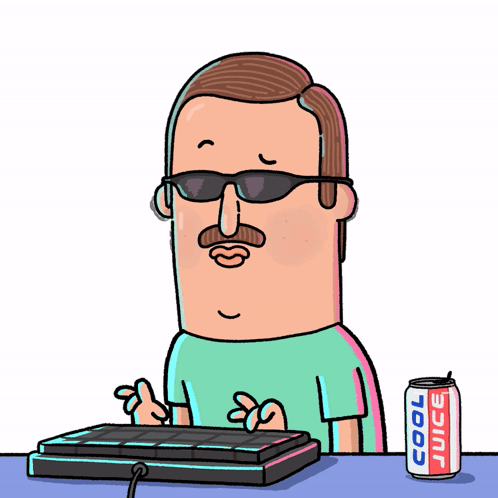 Content Description: a cartoon of a man using a keyboard next to a cool juice can