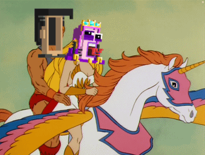 Content Description: a cartoon of a man riding a unicorn with a pixelated face