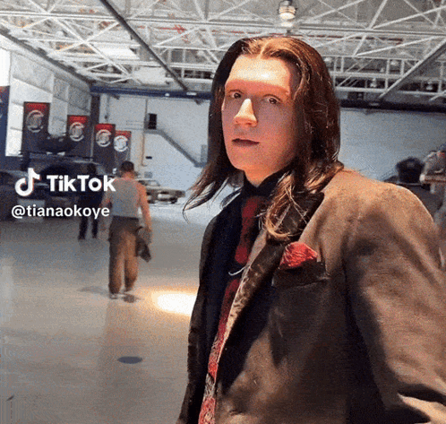 Content Description: a man with long hair is wearing a suit and tie and has a tiktok icon above his head