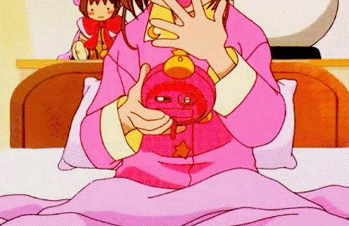 Content Description: a girl in a pink pajamas is sitting on a bed holding a pink clock