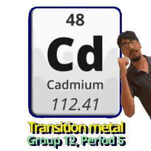Content Description: a man is standing in front of a sign that says 48 cd cadmium 112.41 transition metal group 12 period 5