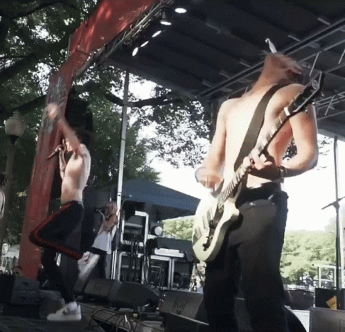 Content Description: a man playing a guitar and a man singing on stage