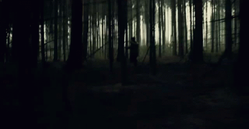 Content Description: a person is walking through a dark forest with trees in the background .