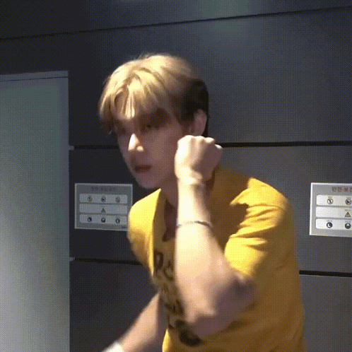 Content Description: a man in a yellow shirt is standing in front of a wall with a sign that says ' a ' on it