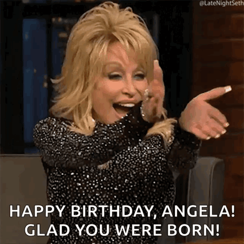 Content Description: dolly parton is celebrating her birthday and says happy birthday angela glad you were born !