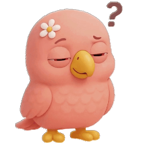 Content Description: a pink bird with a flower on its head has a question mark on its head