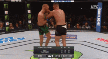 Content Description: two men are fighting in a ufc ring with a bud light banner in the background