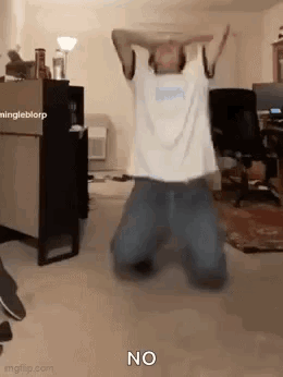 Content Description: a man is kneeling down in a room with his arms in the air and the word no on the floor .