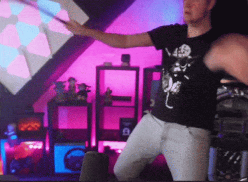 Content Description: a man in a black shirt with a skeleton on it stands in front of a pink wall