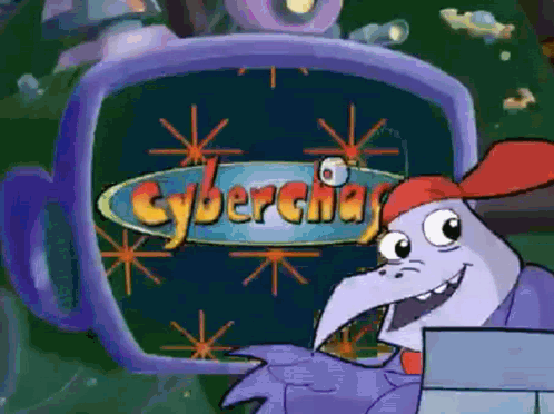 Content Description: a cartoon character is smiling in front of a screen that says cyberchasers