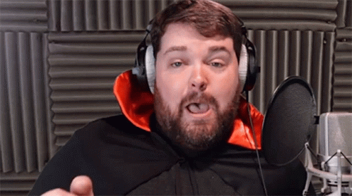 Content Description: a man with a beard is wearing headphones and a cape while talking into a microphone .