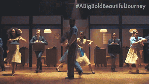 Content Description: a group of people are dancing in an office with #abigbold beautifuljourney written on the bottom