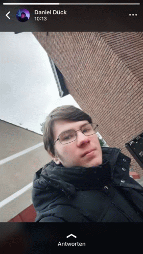 Content Description: a man wearing glasses and a black jacket is standing in front of a brick building