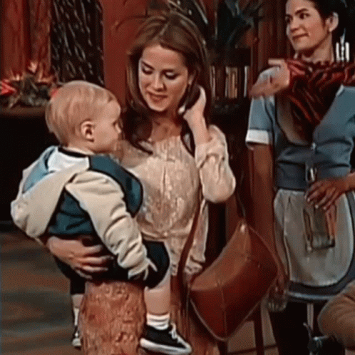 Content Description: a woman holds a baby in her arms while talking on a cell phone