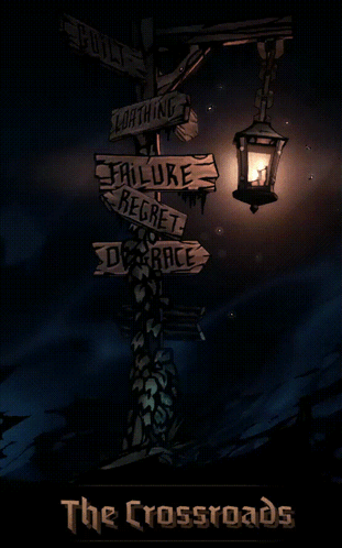 Content Description: a poster for a game called the crossroads shows a street sign