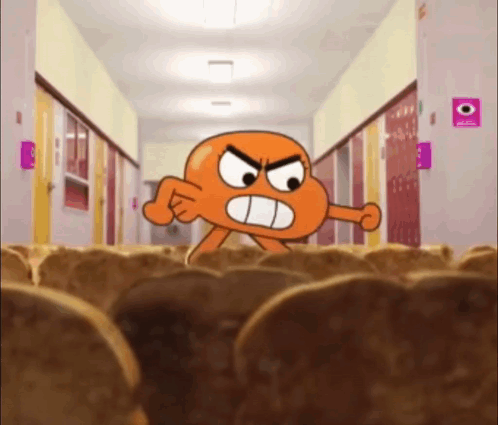 Content Description: a cartoon character is standing in a hallway with a bunch of chairs