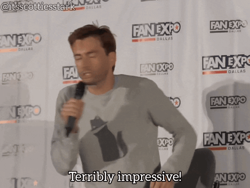 Content Description: a man stands in front of a wall that says fan expo dallas