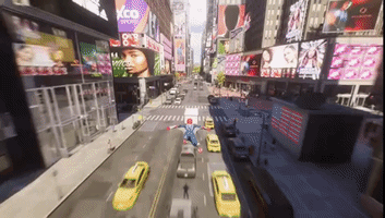 Content Description: an aerial view of a city street with a billboard for xco sports in the background